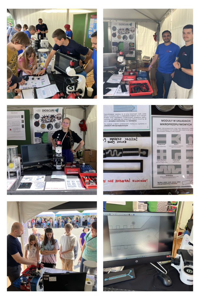 All visitors, including the youngest, were very enthusiastic about our “Extraordinary World of Microflows”, where they could learn about the key physical phenomena that determine the properties of flow on such small scale. Laminar flow, diffusion, and Brownian motion the Picnic participants observed on a large screen showing an image of a microfluidic channel under a microscope, they also learned how we prepare such systems in laboratory conditions, and they even created their own microfluidic systems from blocks. A puzzle referring to the construction of such systems from modules with blocks was very popular.