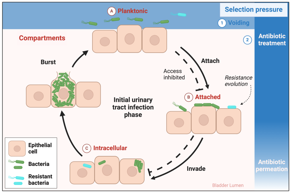 In this project we take a physics-inspired approach and address these questions through a combination of laboratory experiments and mathematical modelling. We develop experimental model systems of urinary infections together with advanced imaging methods to investigate the population dynamics of bacterial invasion of the bladder epithelium. Mathematical models are used to interpret and direct experiments. The project fills an important gap between in vitro and animal models of infections. It enables quantitative research of bacterial ecology and evolution in an environment closer to the environment of the host than previous works, explore fascinating non-equilibrium physics of intracellular bacterial colonies, and the structure of within-host fitness landscapes.